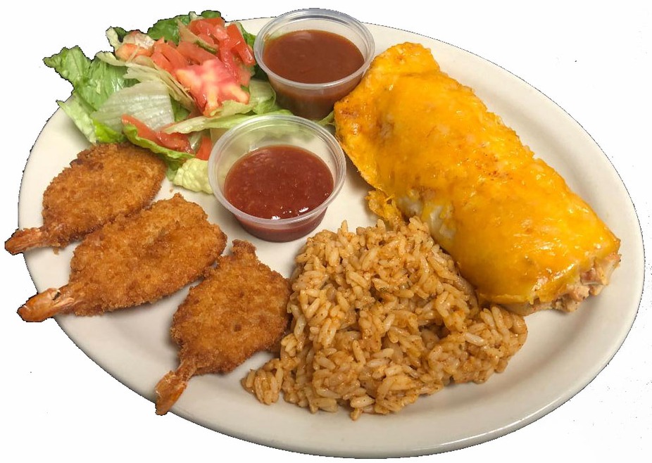 Chicken Enchilada & Shrimp …….......$13.99 Three Fantail Shrimp – - Served with Spanish Rice and Salad Bar.