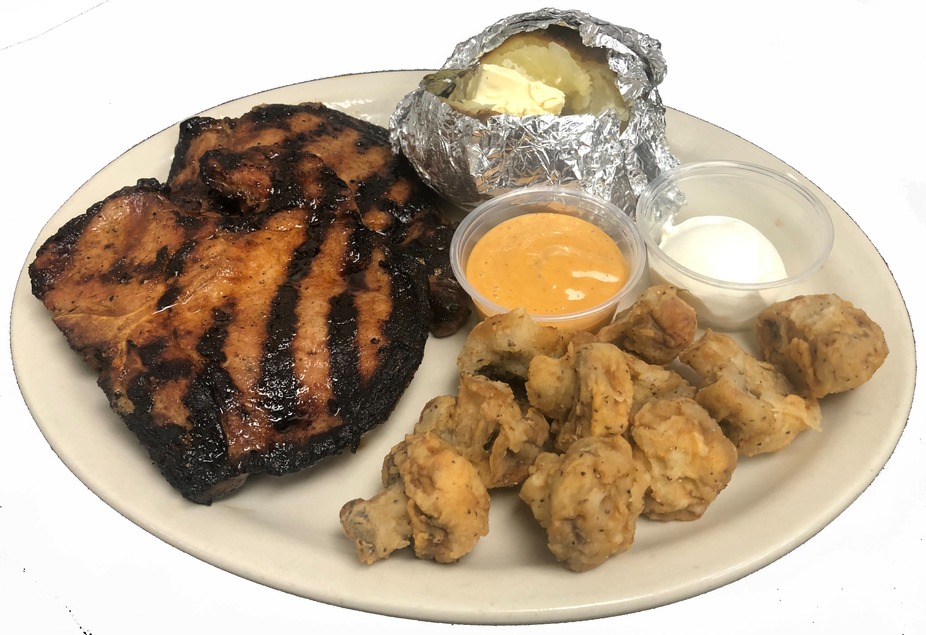 Marinated Pork Chops n’ Rooms......$15.79 Our Hand Cut Pork Chops Marinated Overnight and Grilled to Perfection served with a Sampling of Our Hand Breaded Southwest Mushrooms and Chipotle Sauce - Choice of One Side and Salad Bar.